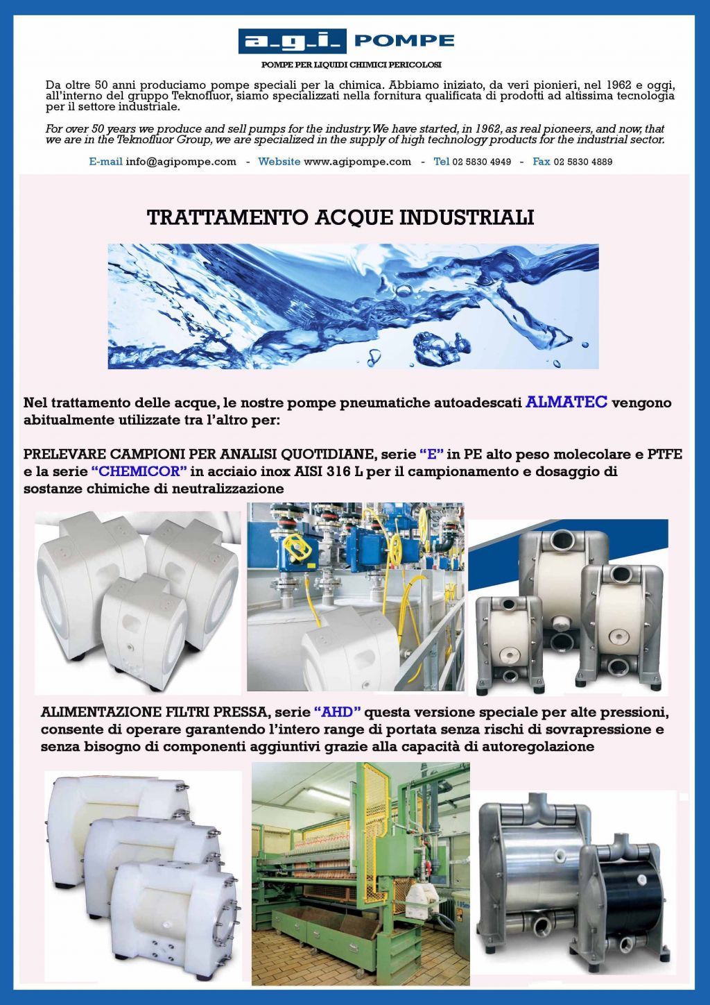 In the sector of industrial water treatment, the self-priming double-membrane pumps ALMATEC find one of their own natural positions, answering to the various physiological requirements such as sampling, rapid dosing of chemicals for neutralization, water/sludge separation, so feeding press filters , etc.
