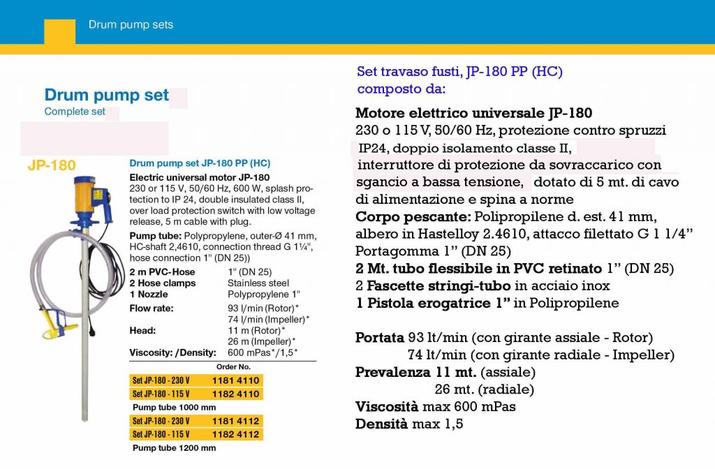Grazie alla sua architettura modulare, il set JP-180 può essere completamente configurato in base all'applicazione: il corpo pompante è disponibile in acciaio inox (ideale per l’industria alimentare, cosmetica e per fluidi chimici compatibili), in polipropilene (PP) per il travaso di acidi commerciali e in PVDF per acidi molto aggressivi come acido fluoridrico, nitrico o perossidi. Anche il tubo flessibile e la pistola erogatrice possono essere scelti negli stessi materiali per assicurare compatibilità e durata nel tempo. Le lunghezze disponibili per lo stelo sono 700, 1000 o 1200 mm, adattabili a diversi formati di contenitore.